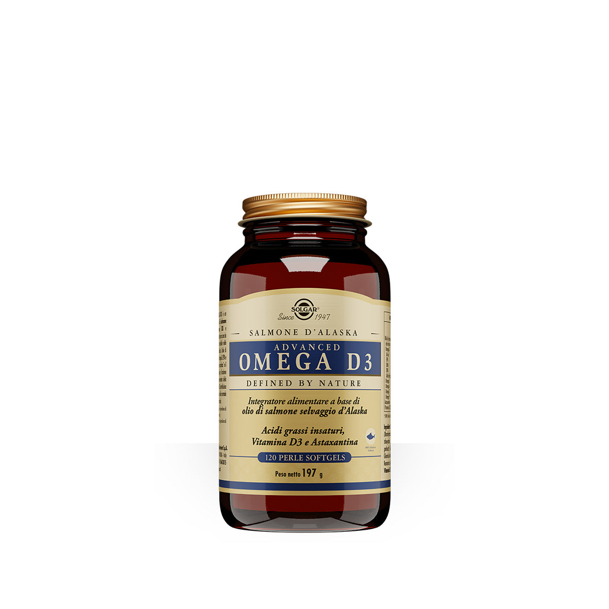 SOLGAR Advanced Omega D3 è un integratore alimentare a base di olio di salmone selvaggio dell’Alaska, fonte di acidi grassi polinsaturi, in associazione a vitamina D3 e astaxantina. Quest'olio fornisce lo spettro completo degli acidi grassi omega (3,5,6,7,9) e offre un elevato rapporto omega-3 / omega-6 utile per bilanciare la quota di omega-6 introdotti con la dieta.
