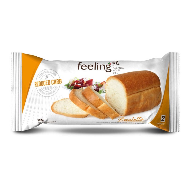 FEELING OK Bauletto Start 2 è un morbido Pane Low-Carb pronto da affettare, realizzato completamente senza Farina e con un elevato contenuto di Fibre e Proteine che lo rendono perfetto per accompagnare i tuoi pasti con un prodotto salutare e 100% Light o per una pausa gustosa.