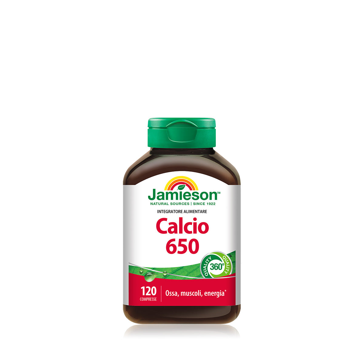 JAMIESON Calcio 650 è un integratore alimentare di calcio. Il calcio è un minerale essenziale con molteplici ruoli biologici. Il 99% della sua quantità totale è concentrata nelle ossa sottoforma di carbonato. È fondamentale per lo sviluppo e per il benessere di ossa e dei denti.