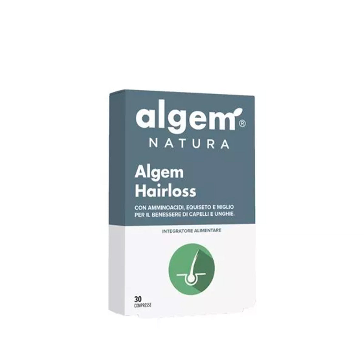 Algem Hairloss è un integratore alimentare a base di L-Metionina, L-Cistina, minerali e vitamine con Estratto di Equiseto e Miglio che contribuiscono al benessere dei capelli e delle unghie, mentre il Selenio e la Biotina contribuiscono al mantenimento del normale stato dei capelli.
